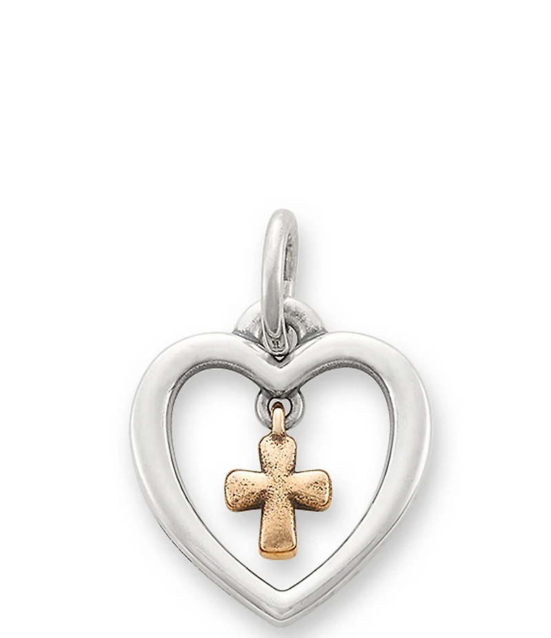 This mixed metal charm is a sweet reminder that love and faith are embedded together in life. A sterling silver open heart showcases a bronze cross charm dangling inside, symbolic of keeping your beliefs as the core of your life. The swaying of the cross prompts us to remember that others may test our resilience, but as long as love surrounds us, we are strong. Choose a necklace, ring or bracelet to place this religious charm on and provide some movement to your charm collection. From James Avery, this charm features: Sterling silver / bronze Approx. 0.56" L x 0.5" W Crafted in America using the world's finest materials.