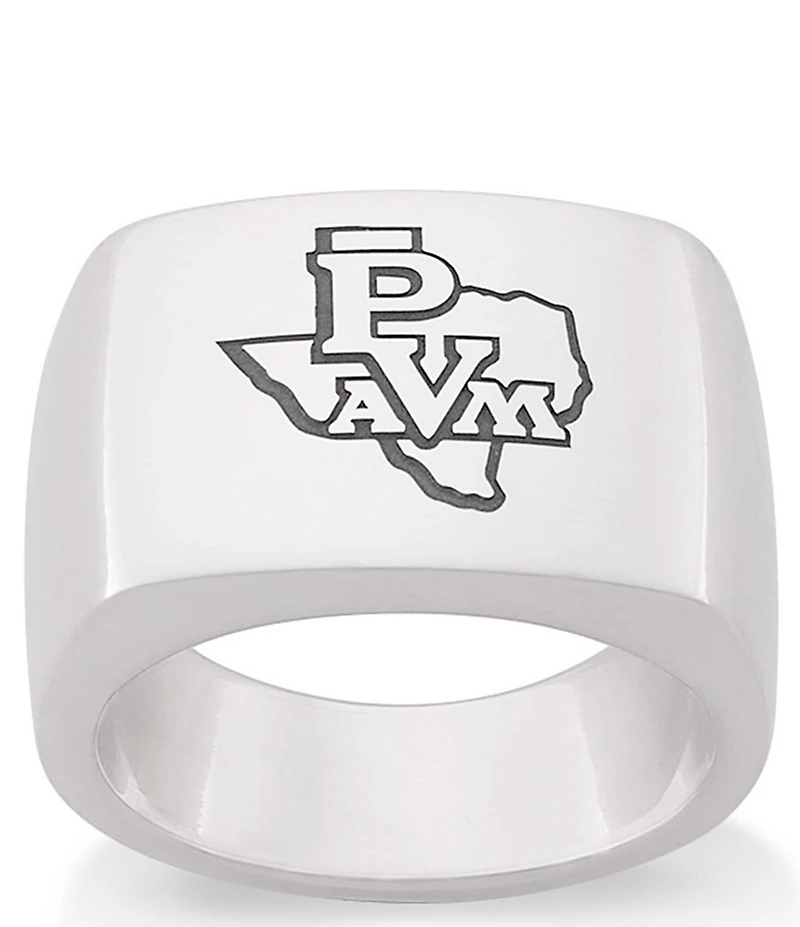 We brought back our Engravable Aventura Ring and gave it a little university pride. Part of our College Collection, this officially licensed Prairie View A&M University Signet Ring features the PVAMU logo engraved in sterling silver for a clean and classic look. Made for fans who show up season after season, it s designed to be worn long after graduation. Engrave the inside of the band with your name, graduation year, or initials to make it extra personal. Product Specifications: Sterling Silver This is an officially licensed collegiate product and the name or logo featured on the item is a registered trademark of the university. From James Avery, this ring features: Sterling silver Approx. 9/16" L x 13/16" W Crafted in America using the world's finest materials.