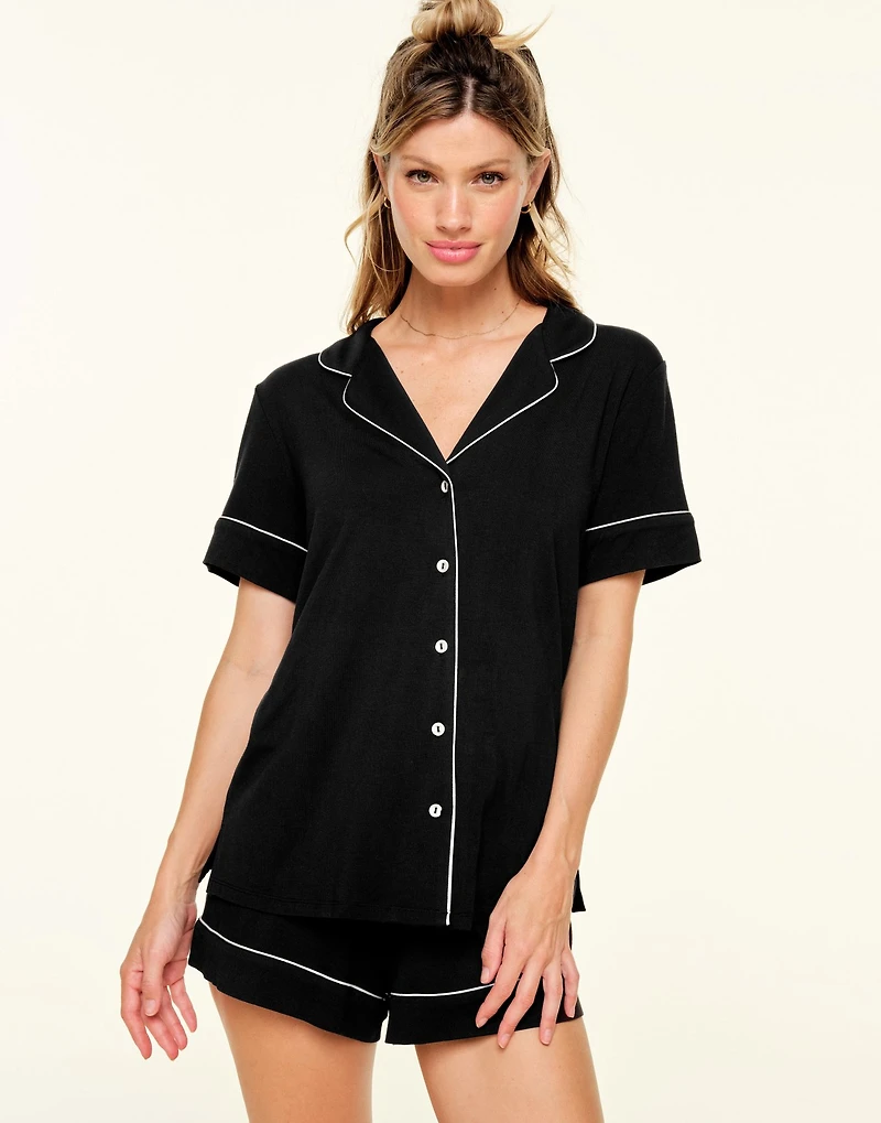 The Jane black short sleeve top and shorts PJ set is made from our softest knit fabric. The notched collar button-down and contrast piping details make this style perfect for sleeping or lounging around the house. (Available in sizes XS-4X)
