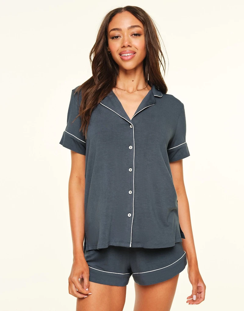 The Jane short sleeve and short PJ set is a bestseller for a reason! Made from our ultra-soft jersey fabric, this set is as comfortable as it is cute. The notched collar and contrast piping details add a feminine touch, while the matching shorts keep it casual and relaxed. This set is perfect for a cozy night in. (Available sizes in XS-XL.)