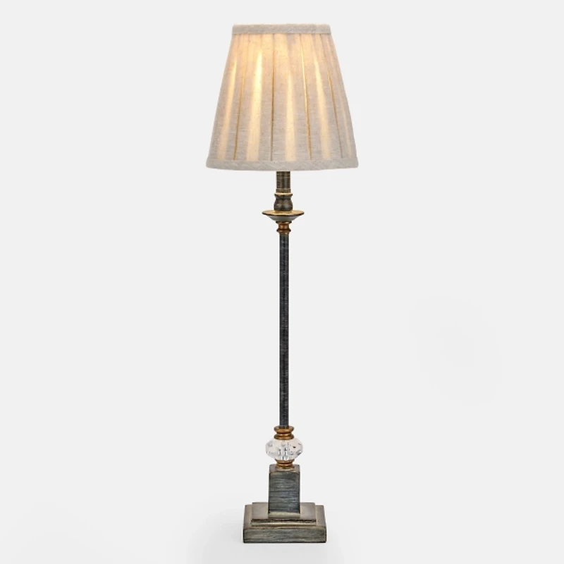 Elevate your interior with our Jane Midnight Crystal Buffet Lamp! This buffet lamp blends classic design with modern refinement to complement a wide range of décor styles. Total lamp measures 28H in. Crafted of resin Midnight blue finish Candlestick body with a crystal accent Hardback tapered shade in oatmeal fabric Shade measures 5 x 6.25 x 7.5 in. Socket accommodates a 60-watt, Type E12 bulb Includes a clear, 6 ft. plug-in cord Weight: 2 lbs. Care: Dust with a soft, dry cloth. Do not exceed specified wattage. Contact your local Kirkland's store for availability. Quantities and selection may vary by location.