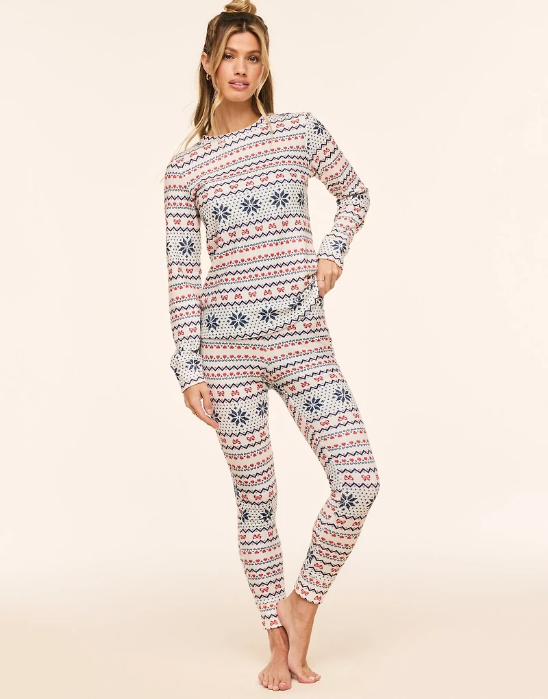 This sleepwear set is a classic white knit set that will keep you looking and feeling your best, even when you're just lounging around the house. The printed waffle knit long-sleeve top and matching leggings are both super soft and comfortable and the leggings feature an elastic waistband. (Available in sizes XS-4X)