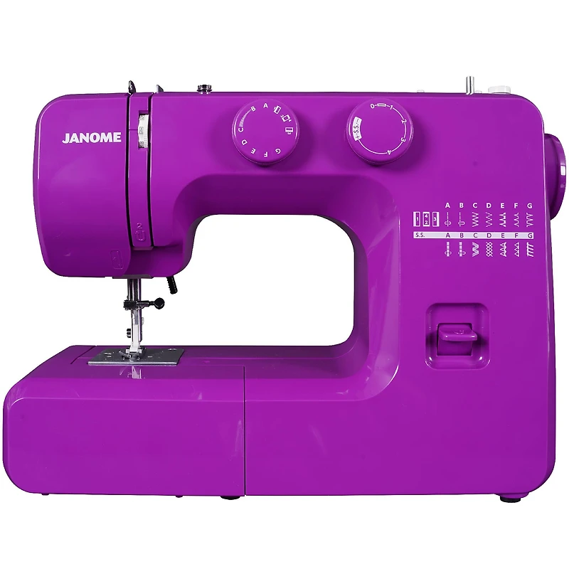 Fun colors. Serious sewing. Experience the fun of sewing with the Janome Purple Majesty sewing machine! The Janome Purple Majesty easy-to-use sewing machine was designed with beginners in mind! It includes an easy-to-follow instruction manual, Quick Start Guide and YouTube video tutorials! This vibrant sewing machine also has a built-in bobbin loading guide that's impossible to miss, and is easily found within sight of the bobbin loading area. Boasting convenient features like 15 of the most popular and versatile built-in stitches, a four-step buttonhole, adjustable stitch length and a front-loading bobbin system, this sewing machine will be one you can grow into. Don't let the fun colors fool you, this full-sized sewing machine also has an interior heavy duty metal frame, dual retractable spool pins, and four presser feet. The Janome Purple Majesty sewing machine is versatile, so you can tackle projects like garment sewing, home décor, quilting and even heirloom projects with ease!Details:Purple Majesty7" x 16" x 12"15 built-in stitches4-step buttonholeFront-loading bobbin systemHeavy duty interior metal frameAdjustable stitch length and zigzag widthReverse leverDarning plate3-piece feed dog systemRemovable free armDual retractable spool pinsTutorial videos, built-in bobbin diagramQuick start guide includedIncludes 4 presser feet, beginner accessories, easy-to-follow instructional manual25-year limited warranty