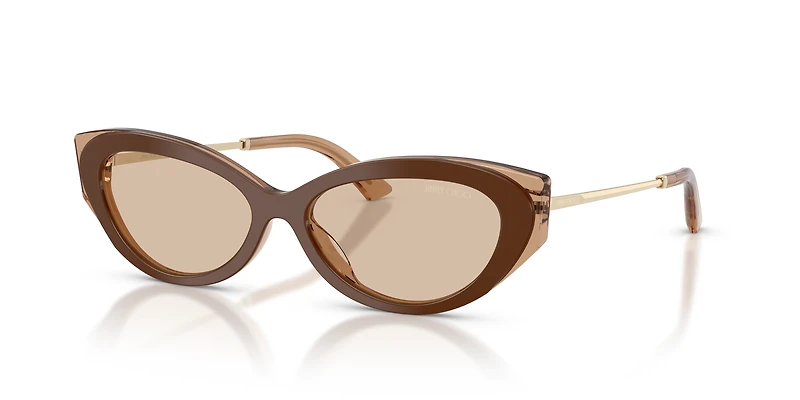 Elevate your style with the Jimmy Choo JC5065U sunglasses. These stunning cat-eye frames feature a bi-layer acetate front in rich brown for a refined yet bold look. Slim metal temples are laser-engraved with the iconic Jimmy Choo logo, adding a touch of sophistication. Finished with classic brown lenses, these brown sunglasses offer both glamour and versatile elegance. Perfect for any occasion, these Jimmy Choo sunglasses are a seamless blend of comfort and dazzling design.