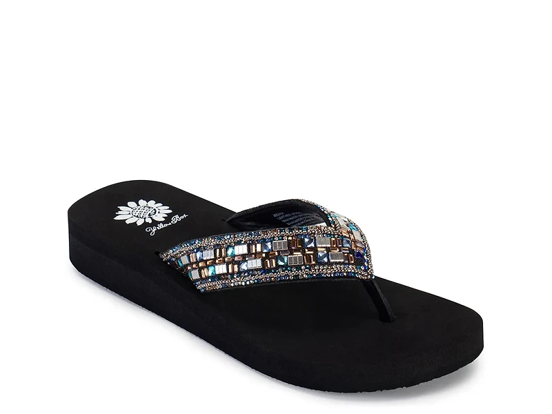 Bring well-rounded style to your summery wardrobe with the Jediah sandal from Yellow Box. This wedge pair sports signature EVA memory foam cushioning for a soft feel underfoot, while the sparkly upper catches the eye.