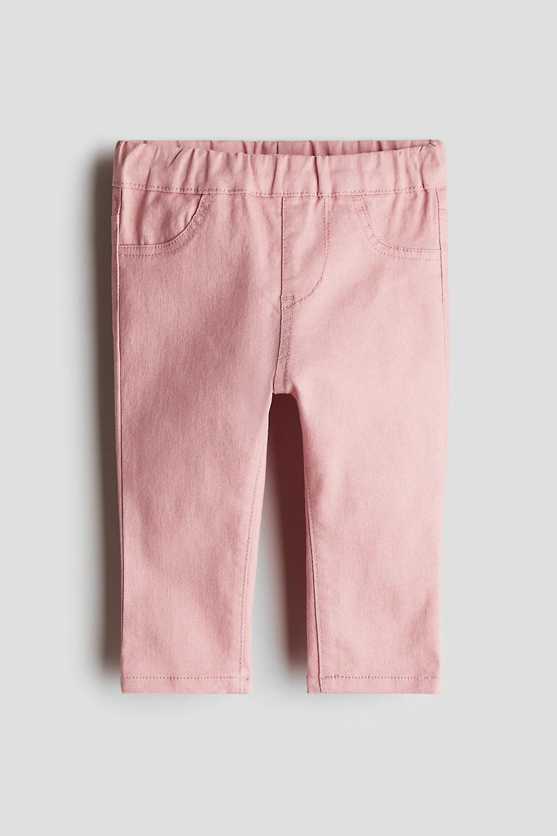 Jeggings in soft, woven fabric. Adjustable elastic at waistband, mock fly, and mock front pockets.