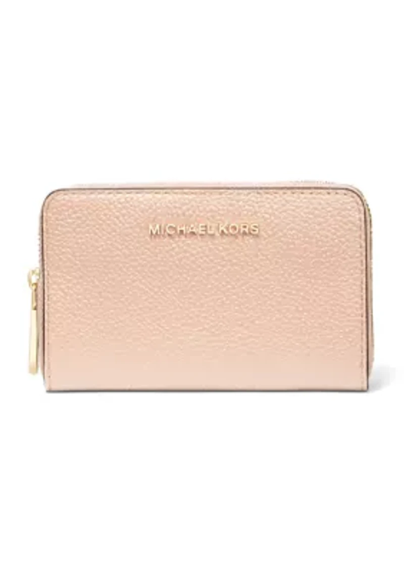 Luxe pebbled leather distinguishes the MICHAEL Michael Kors zip-around card case, allowing you to carry only the essentials with designer style. Zip closure Exterior: back slip pocket Interior: 2 back credit card slots, center credit card slot, 2 front credit card slots Imported Product Specifications 5" W x 3.25" H x 0.75" D Material & Care Leather Clean with a damp cloth or soft brush