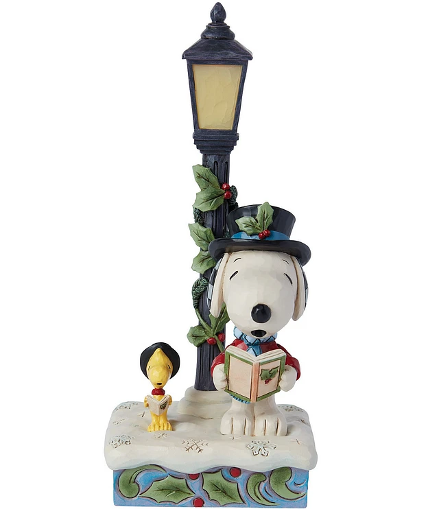 Jim Shore Peanuts Collection Snoopy & Woodstock next to Lit Lamp Post Figurine