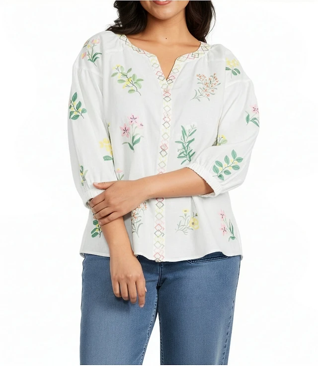 John Mark Plus Size Woven Floral Embroider Y-Neck 3/4 Blouson Sleeve Top