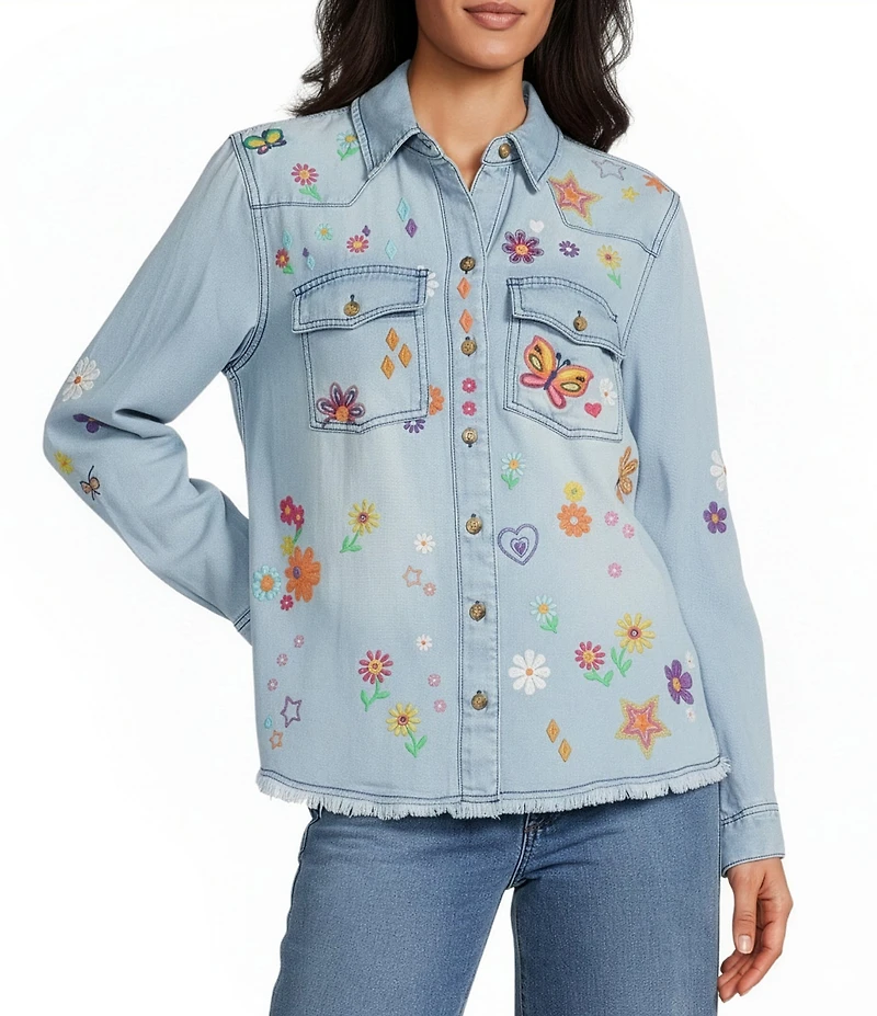 From John Mark, this blouse features: Woven fabrication Embroidered flowers, butterflies and stars Point collar Long roll-tab sleeves Two front functional chest pockets Curved hemline Button front closure Approx. 26.5" center front, 27.5" center back length Lyocell, exclusive of decoration Machine wash cold/ tumble dry low Imported.