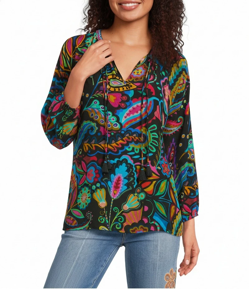 From JOHNNY WAS, this blouse features: Silk woven fabrication Silvana paisley floral print Split v-neckline with tassel ties and embroidered banded collar Bracelet sleeves with elastic cuffs Straight hemline with side slits Pullover construction Approx. 27" length Silk Dry clean Imported.
