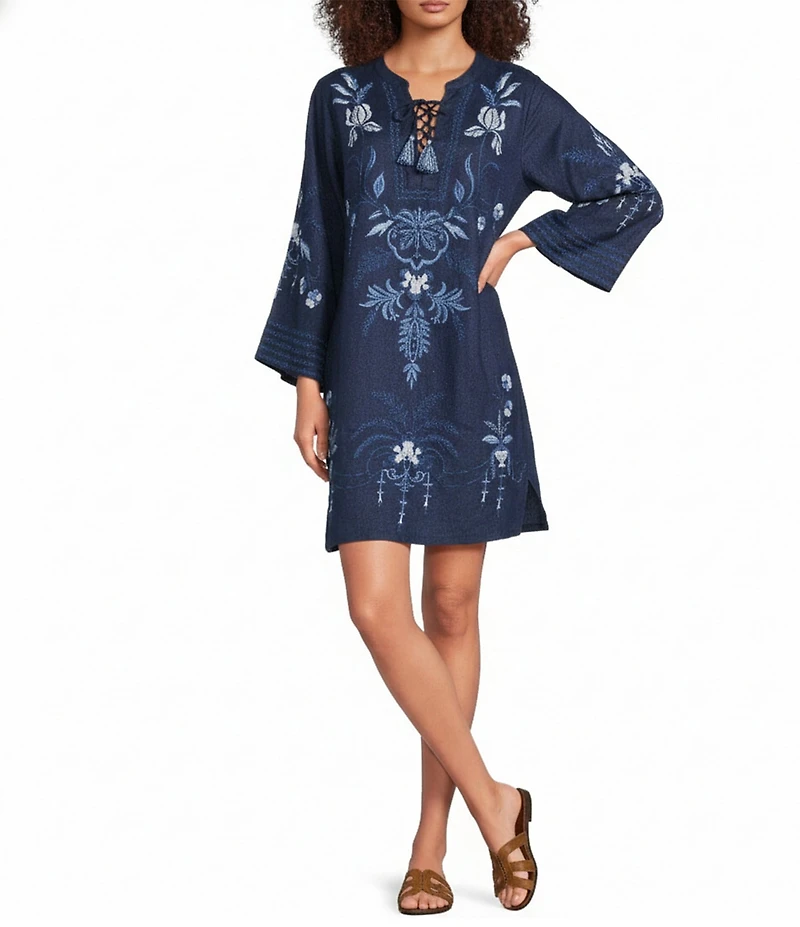 From JOHNNY WAS, this dress features: Linen woven fabrication Placement floral embroidery details Split v neckline with tassel-tie lace-up detail 3/4 kimono sleeves Straight hem with side slits Pullover construction Approx. 36" length Linen Machine wash Imported.