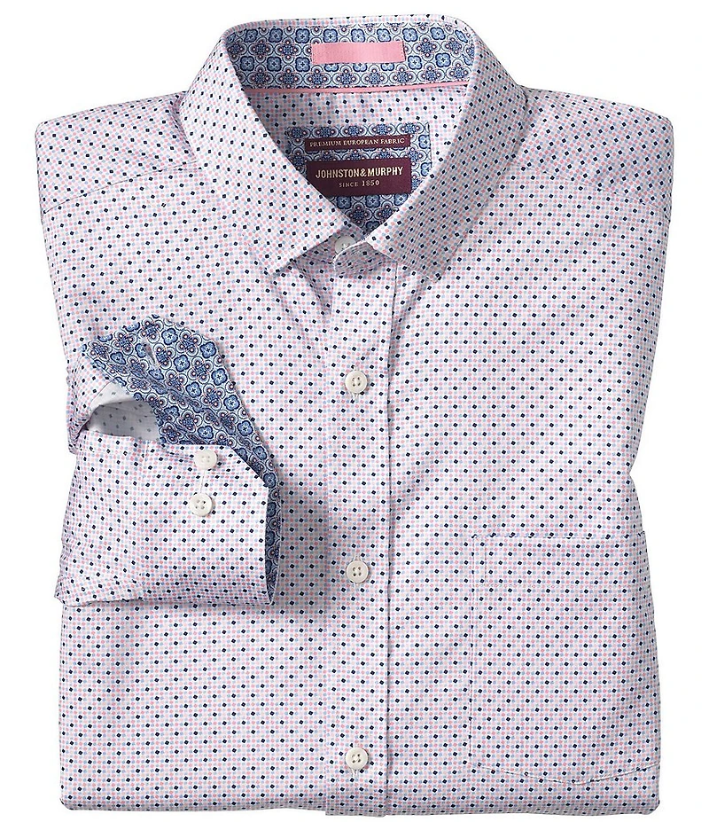 From Johnston & Murphy, this shirt features: Micro diamond print Hidden button-down collar Long sleeves Button-front closure Pocket at left chest Shirttail hem Stretch fabric Cotton/spandex Machine wash/tumble dry Imported.