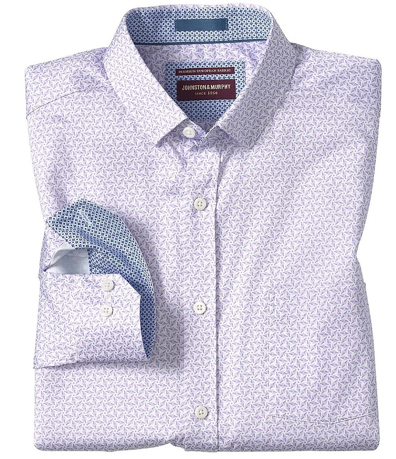 From Johnston & Murphy, this shirt features: Allover pinwheel print Hidden button-down collar Long sleeves Button-front closure Pocket at left chest Shirttail hem Stretch Cotton/spandex Machine wash/tumble dry Imported.