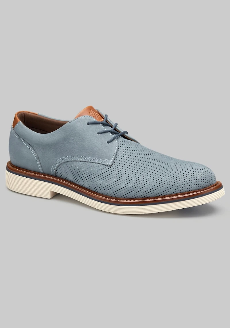 Crafted from soft nubuck leather, these perforated plain toe Oxfords bring a modern, breathable twist to a classic laceup silhouette. The smooth leather lining enhances comfort, while a removable, contoured footbed with memory foam provides personalized cushioning that supports you throughout the day. An ultralight TRUFOAM midsole delivers responsive comfort without added weight, complemented by a padded collar and tongue for an easy, secure fit. Finished with durable rubber pods on the outsole for reliable traction, this style blends everyday versatility with elevated, lightweight comfort. Johnston & Murphy Tyson Perfed Plain Toe Oxfords