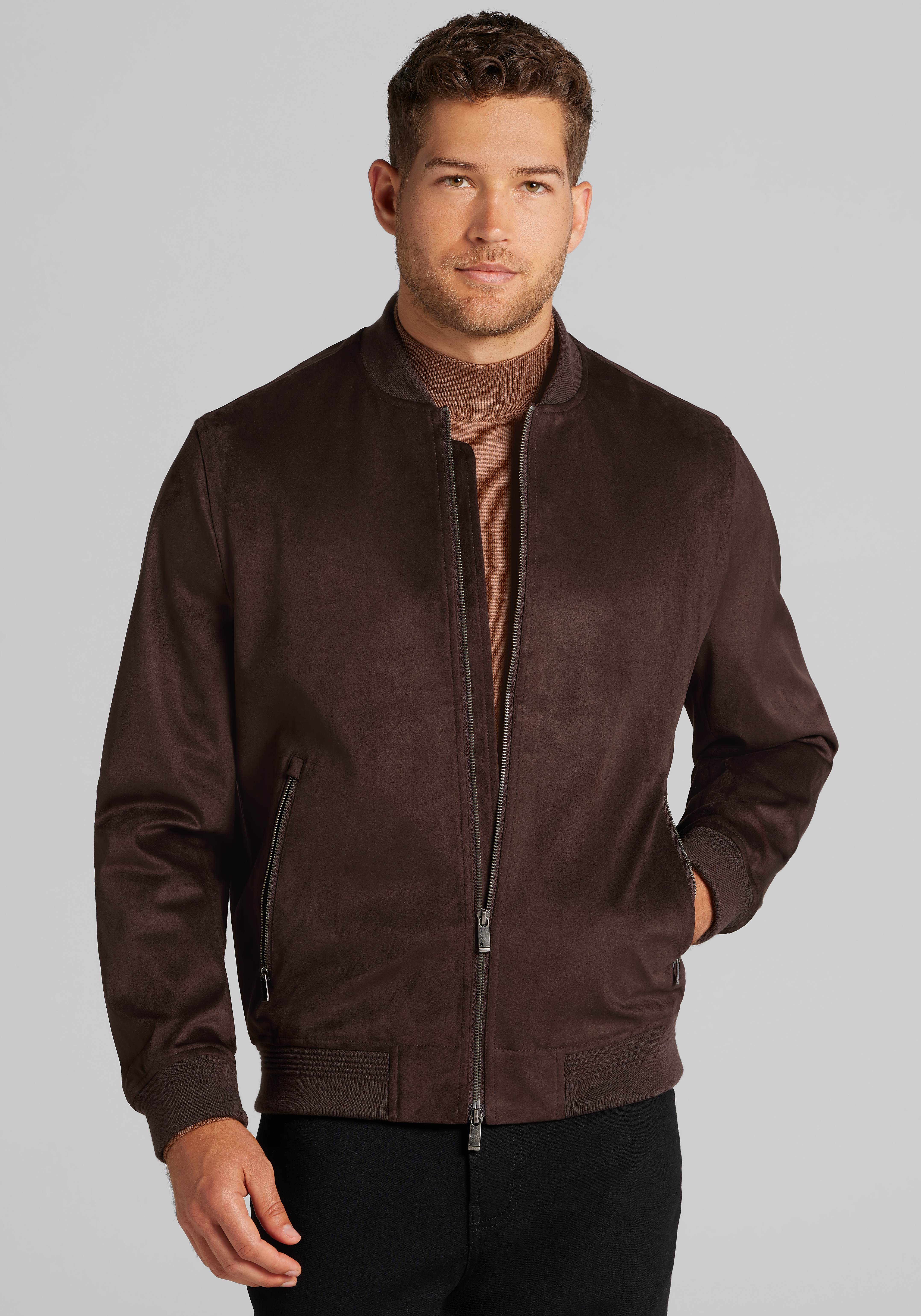 This faux suede bomber jacket from Jos. A. Bank delivers the luxe look and feel of genuine suede without the high price or upkeep. Its smooth, soft texture brings polished style to casual days, while the easy-care fabric makes it a practical pick for everyday wear. A smart choice for those who want timeless style with less hassle.