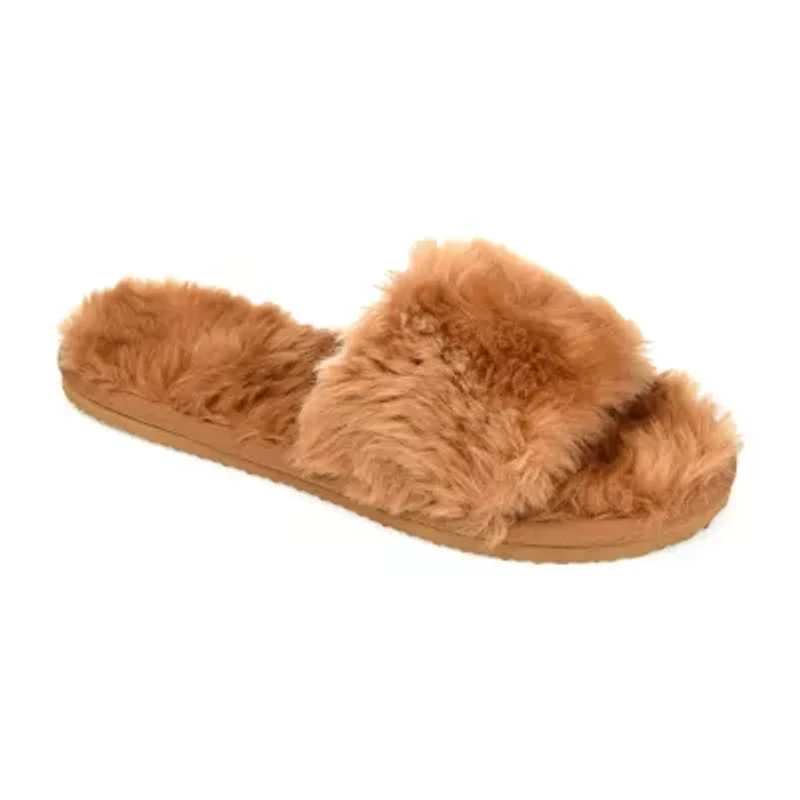 Lounge in absolute comfort. The Dawn by Journee Collection is a plush slide-on slipper featuring an open toe and all-over faux-fur. A sturdy bottom outsole and a dreamy cushioned footbed finish this relaxed look.