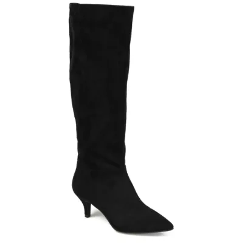 A bold pointed-toe and a kitten heel enhance this classic knee-high boot by Journee Collection. The Vellia is a vegan leather silhouette with a straight shaft and pull-on design with a minimalistic look. A 4 mm true comfort foam footbed finishes this style for added comfort.