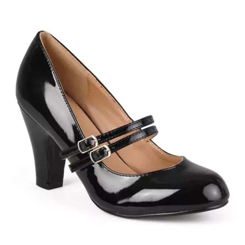 Show off classic style in Mary Jane pumps by Journee Collection. These pumps feature faux leather uppers and highlight a double strap design with dainty buckle accents across the tops of each shoe.