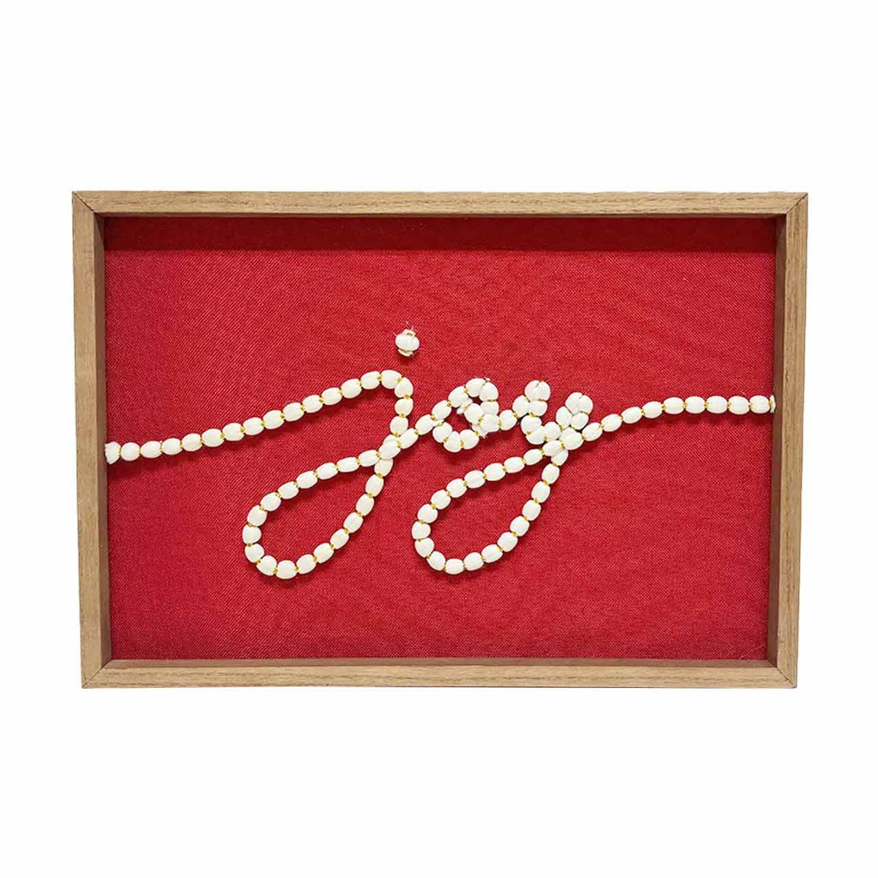The sign features the word "joy" artistically written in a flowing, cursive script, crafted from delicate white beads that add texture and dimension. Set against a vibrant red fabric background, the beaded lettering stands out, creating a striking visual appeal that captures the essence of the holiday season.