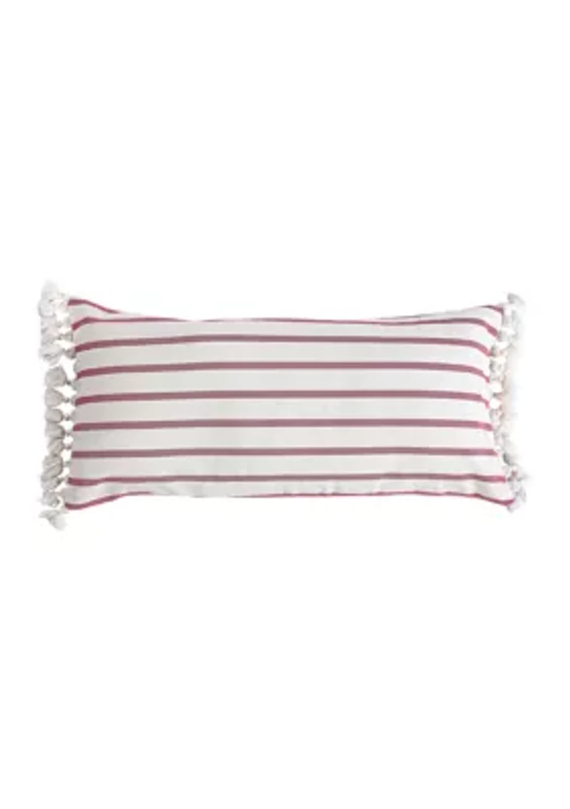 The Deer decorative pillow matches perfectly with the Levtex Home/Thatch Home Joy Birds bedding collection. This pillow features a gorgeous oversized pillow in a red ticking stripe finished with white pom poms in each corner. The sophisticated color palette makes this a versatile accessory for your bed, couch, or favorite chair. The pillow comes pre-filled with a luxurious polyester inner. Imported Product Specifications 14 in x 30 in Canvas Material & Care Polyfill Cotton Machine washable