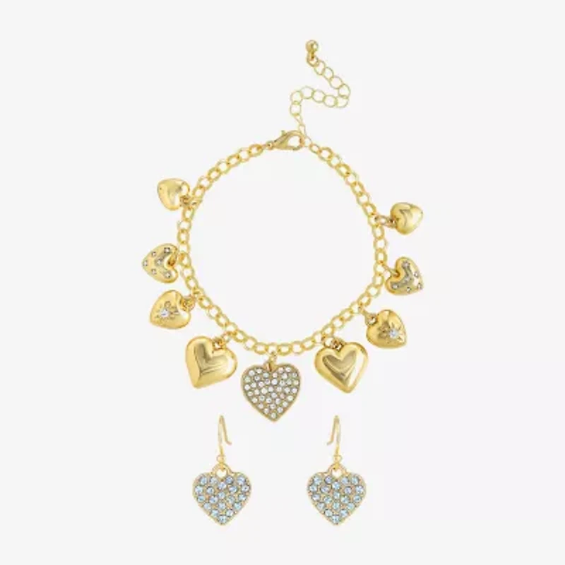 JS Jessica Simpson Gold Tone Charm Bracelet & Drop Earring Womens Crystal Heart 3-pc. Jewelry Set