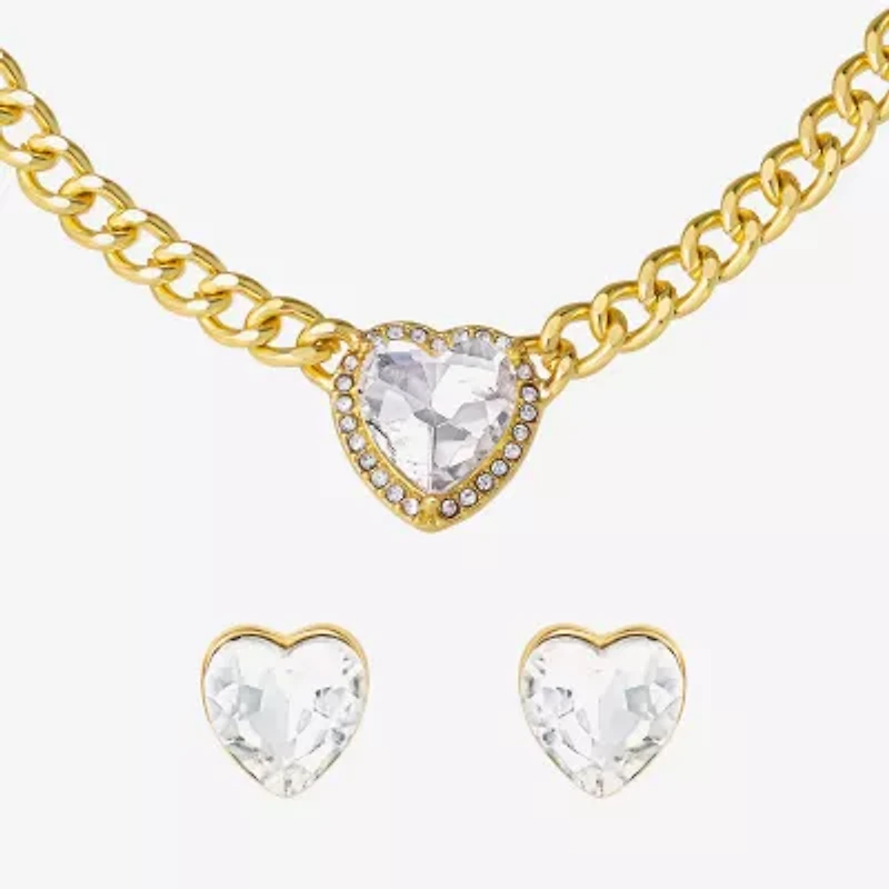 JS Jessica Simpson Gold Tone Collar Necklace & Stud Earring Womens Glass Heart 3-pc. Jewelry Set
