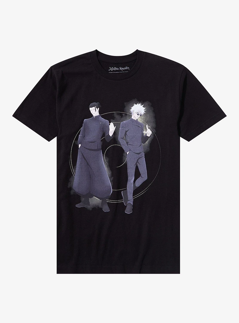 Are you sad because you don't have this Jujutsu Kaisen tee yet or do you not have this Jujutsu Kaisen tee yet because you're sad? Rep Gojo and Geto's youth with this double-sided tee, featuring the duo in their teenage years on the front and their betta fish equivalents on the back side.