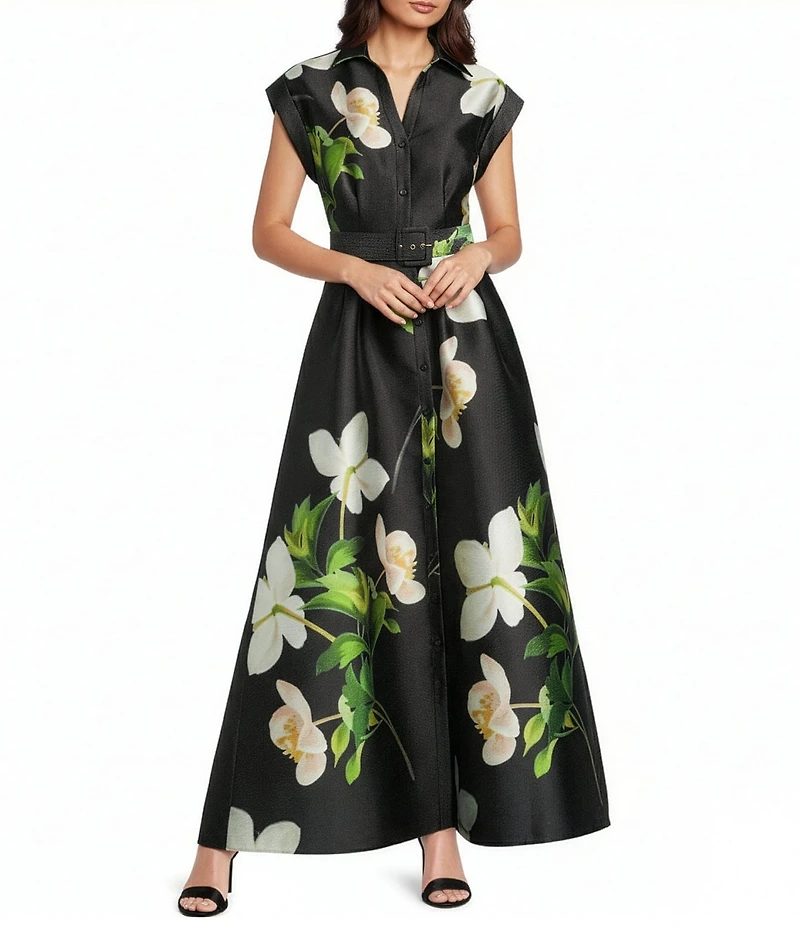 From Julia Jordan, this dress features: Printed mikado fabrication Shirt dress silhouette Collar neckline Short sleeves Floral print Belted Side seam pockets Button front closure Approx. 61" length Polyester Dry clean Imported.
