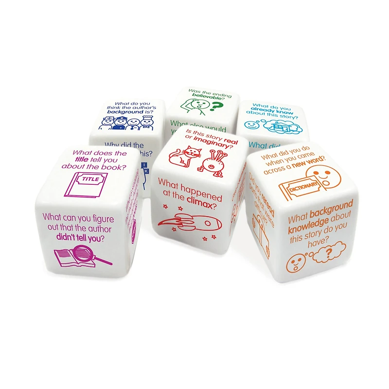 Comprehension Dice are a collection of six soft dice for discussing the meaning of text. Teach building skills in comprehension with six dice. Dice face include questions and statements. Photographic images used throughout. Six soft dice with real images make dice games fun and engaging. Supports development of verbal and creative skills.Details:Multicolored6 soft diceFaces include questions and statementsFor ages 6 and up
