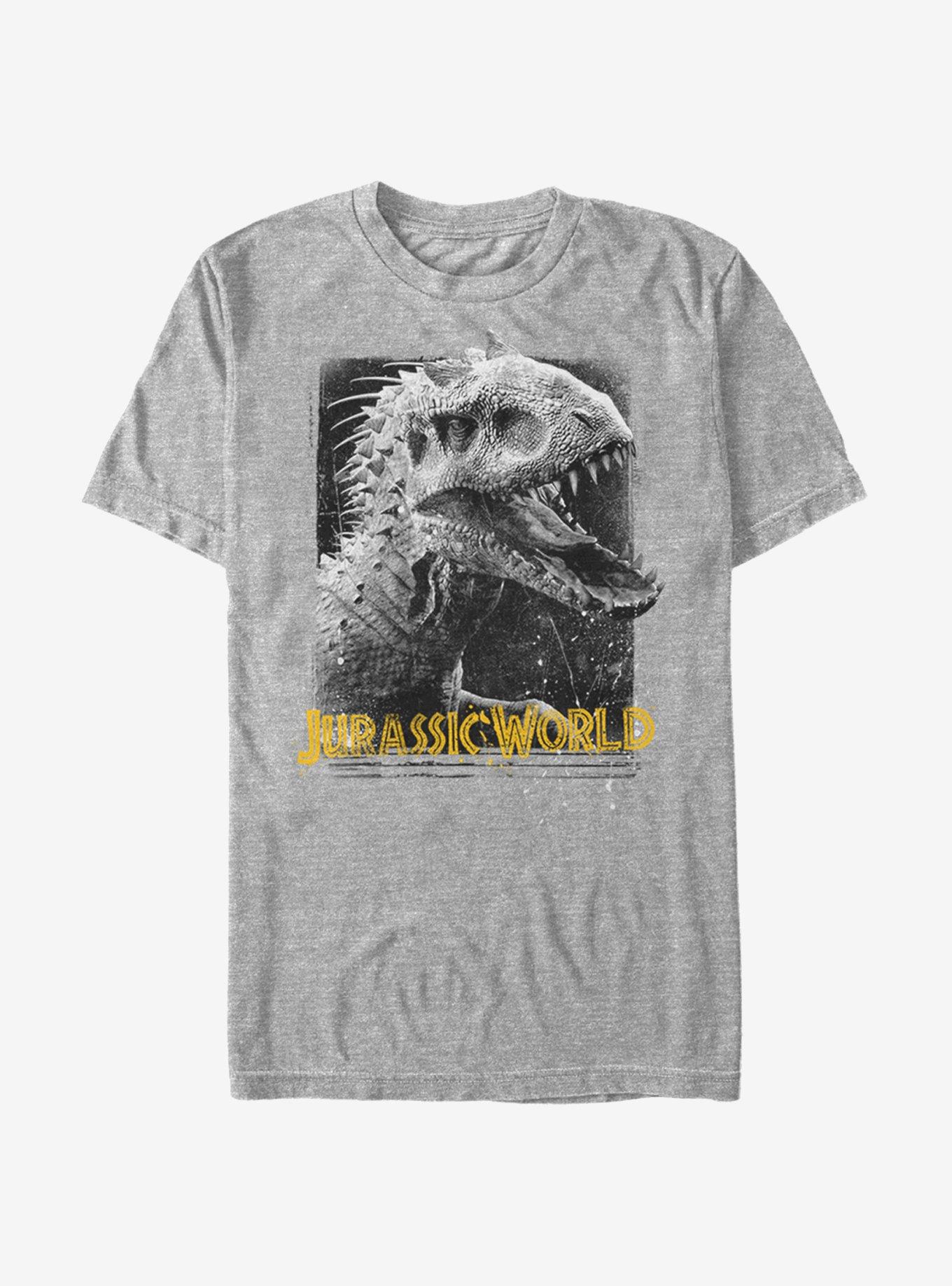 50 feet long fully grown, the Indominus rex might be the most terrifying dinosaur hybrid at Jurassic World we have ever seen. This grey tee features a terrifying Indominus rex with "Jurassic World" verbiage in yellow.
