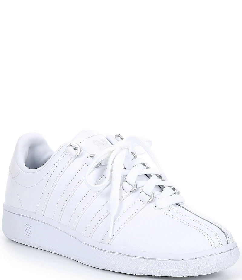 From K-Swiss, the Women's Classic VN Retro Leather Sneakers feature: Sturdy premium leather upper 3-piece toe construction Classic 5 stripe detail on sides Lace up closure Metal D-rings keep the laces in place and ensure all day support Fabric collar lining Soft EVA midsole provides a comfortable fit for all day wear Rubber outsole Imported.