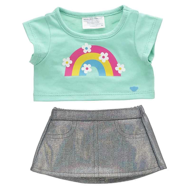 This two-piece outfit for stuffed animals includes a rainbow print shirt with a sparkly denim skirt.