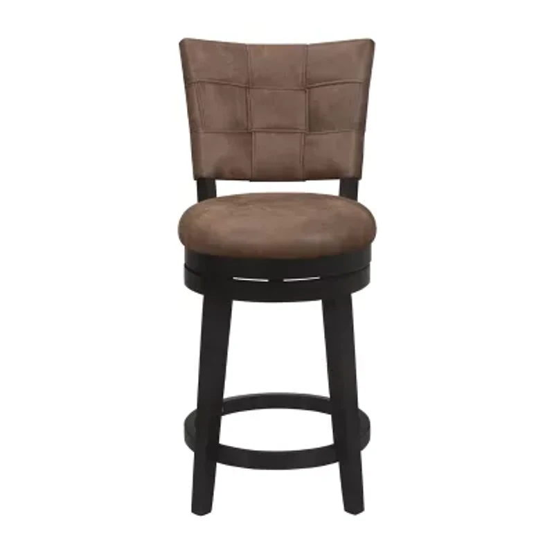 With a classic yet bold silhouette, this contemporary counter height swivel stool is a stunning addition to your kitchen or bar area. Classy faux leather upholstery in chestnut brown covers plush padding in the seat and unique basketweave back while the 360 degree swivel allows easy movement with ultimate comfort. A rich black finish brushed over solid rubberwood frame elevates this swivel stool to new levels of style and class. Together, the neutral colors and simple-but-stylish silhouette make this stool a perfect addition to any home. Assembly required.