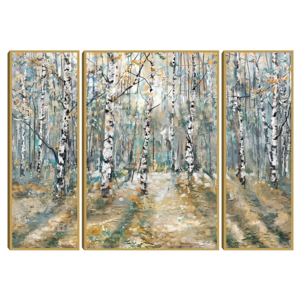 Embrace Mother Nature's beauty with this Kaleidoscope Trees Framed Canvas Prints. With golden light peaking through birch trees, this piece radiates woodland magic! Set includes three (3) framed canvas prints Printed on stretched, polycotton blend canvas Central framed print measures 25W x 1.5D x 37H in. Each lateral framed print measures 13W x 1.5D x 37H in. Gold frame around wrapped canvas Features a natural landscape Hues of white, gold, blue, tan, and black Weight: 20 lbs. Hangs from back-mounted hardware; sawtooth hangers included Care: Dust with a soft, dry cloth. WARNING: Cancer and Reproductive Harm - For more information go to www.P65Warnings.ca.gov .