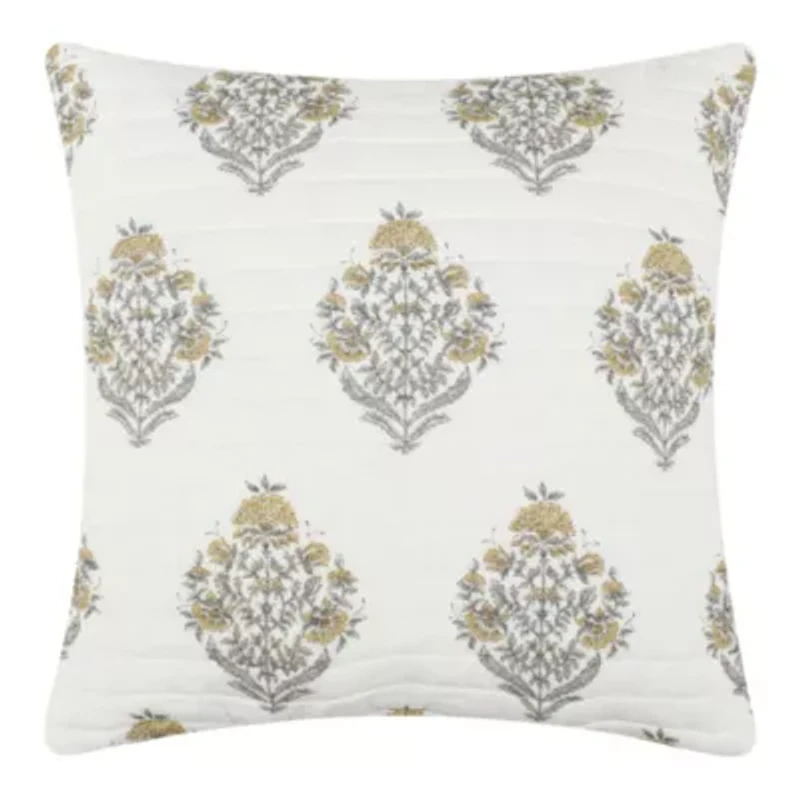 The Floral decorative pillow matches perfectly with the Levtex Home Kamira Ochre bedding collection. This pillow is sized at 18x18in. and features miniature flower bushes in ochre and grey on a cream ground The ochre, grey and cream color palette makes this a versatile accessory for your bed, couch or favorite chair. The pillow comes pre-filled with a soft, luxurious feather inner. Floral Imported Product Specifications 18x18x3 Material & Care Cotton Machine washable