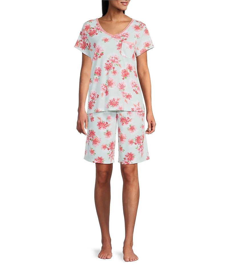 Karen Neuburger Short Sleeve V-Neck Brushed Interlock Knit Painted Floral Print Bermuda Short Pajama Set