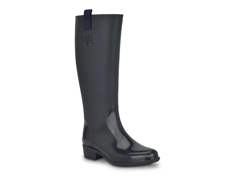 The Tommy Hilfiger Karissa rain boot offers polished style and waterproof protection. This tall boot boasts a water-resistant construction to provide lasting wear and dry comfort. The lugged sole with a block heel finishes this silhouette.