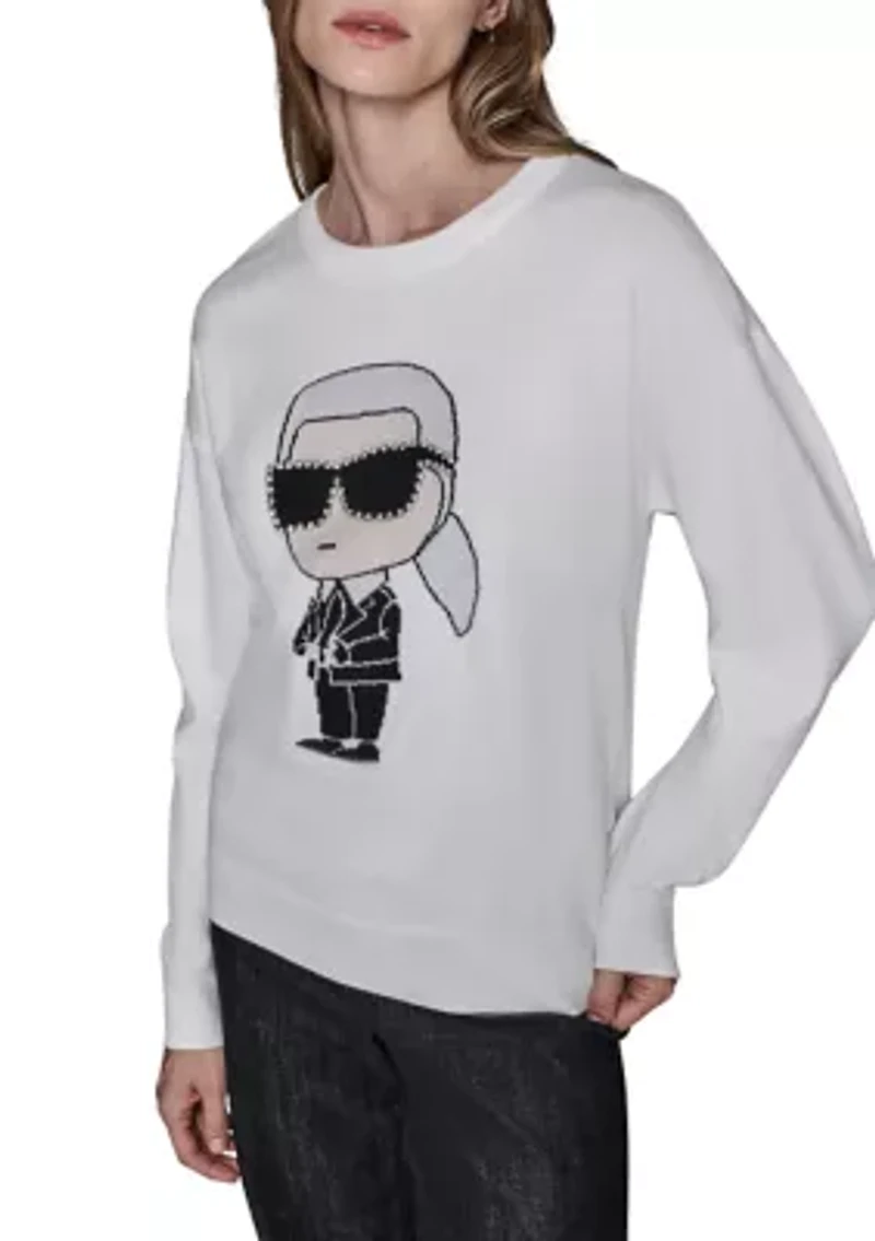 A playful ode to iconic style, this sweater pairs cozy comfort with a touch of Karl's signature charm. Effortless and irresitibly cool - this is the perfect style to eleevate everyday dressing Pullover Crew neck Long sleeve Imported Product Specifications 23.5 in. Material & Care Polyester/Rayon Hand wash or dry clean for best results