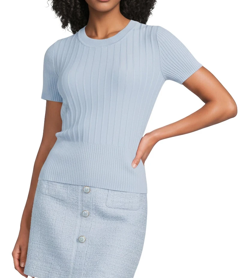KARL LAGERFELD PARIS Ribbed Knit Crew Neck Short Sleeve Sweater
