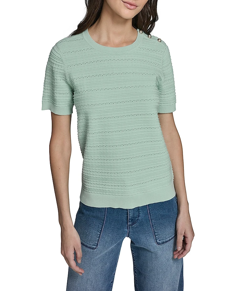 From KARL LAGERFELD PARIS, this top features: Ribbed knit fabrication Round neckline Short sleeves Decorative buttons Ribbed hemline Pullover construction Approx. 23.5" length Viscose/rayon/polyester Hand wash cold Imported. Solid Sweater Short Sleeve solid sweater with button detail on shoulder.