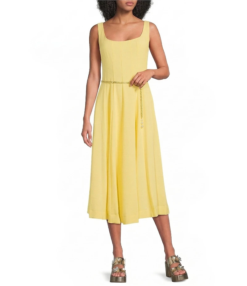 From KARL LAGERFELD PARIS, this dress features: Scoop neckline Sleeveless Lined Chain belt with pearl tassel Center back zipper closure Approx. 41.5" in length Polyester Dry clean Imported.