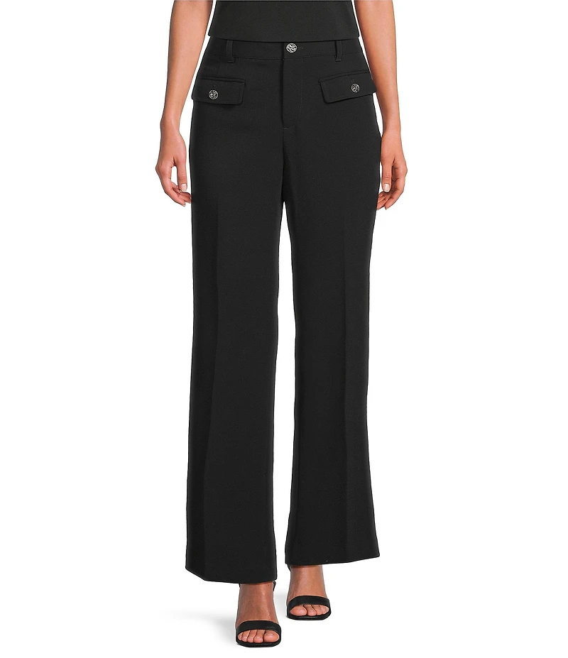 From KARL LAGERFELD PARIS, these pants feature: Textured crepe fabrication Wide leg silhouette Front functional patch flap pockets Lined Ankle length Front button and zipper closure Approx. 32" inseam Polyester Machine wash Imported.