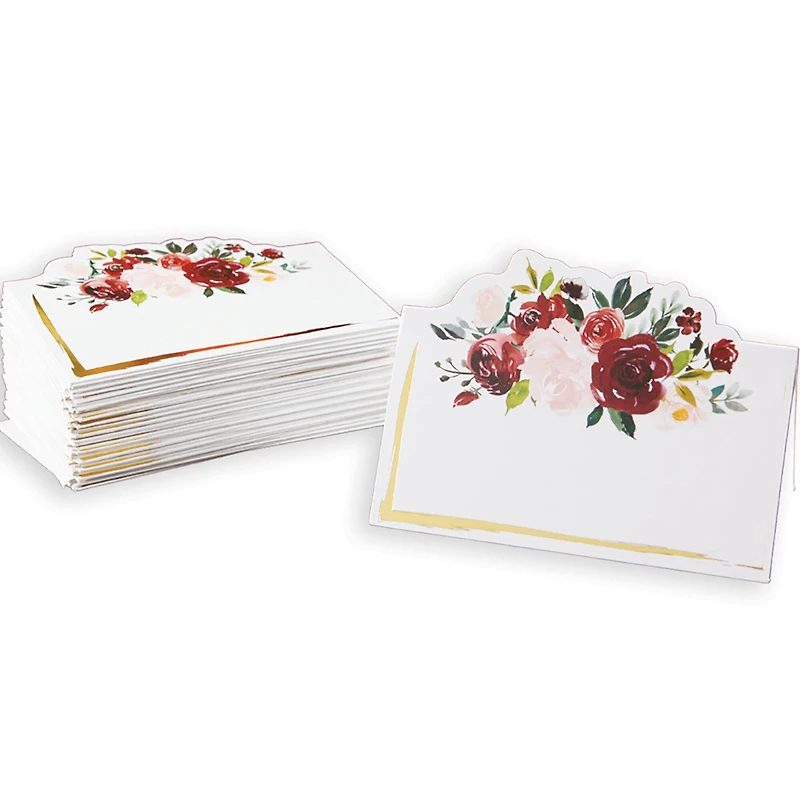Our tent place cards were designed to be a lovely and useful addition to your décor. They are blank with a elegant design on the outside edges, so you have plenty of room to write guest names or labels for food. They are made of the highest quality cardstock, which not only makes them look beautiful but sturdy enough to hold their shape when placing them on your tablescape.Details:Burgundy Blush Floral3.5" x 2.6" x 1.3"3D design50 countCardstock