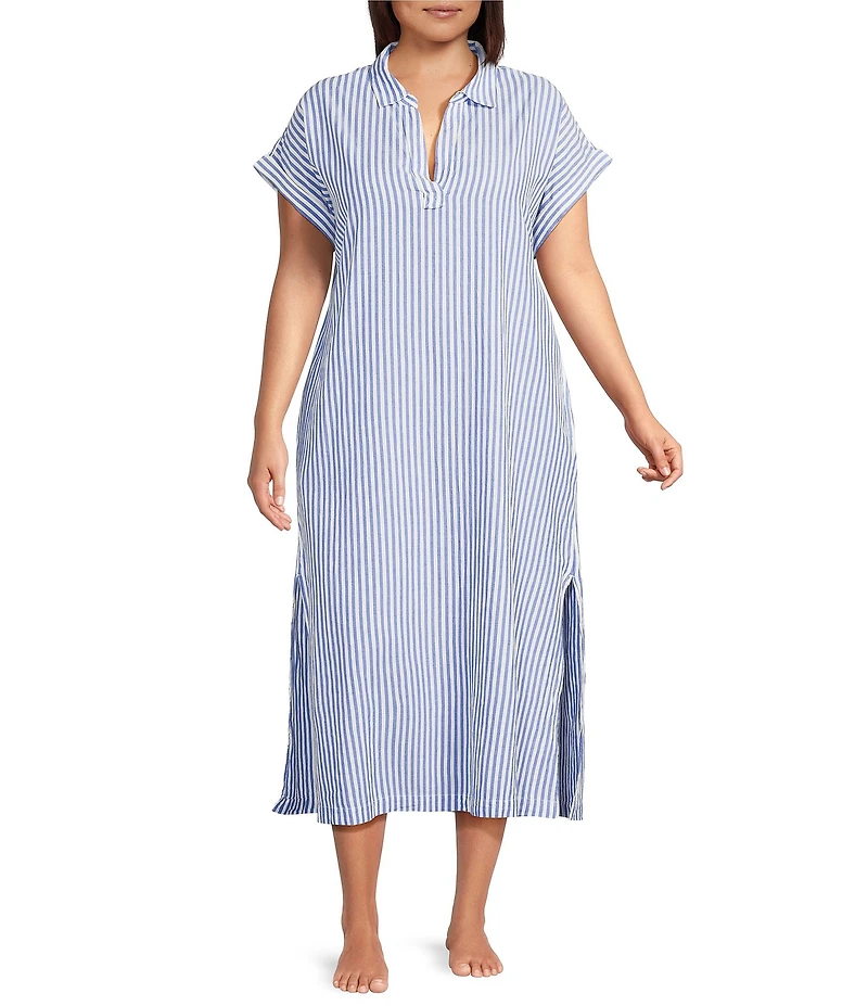 Kate Landry Plus Size Yarn Dye Woven Short Sleeve Split Collared Long CaftanKate Landry Plus Size Yarn Dye Woven Short Sleeve Split Collared Long CaftanKate Landry Plus Size Yarn Dye Woven Short Sleeve Split Collared Long Caftan