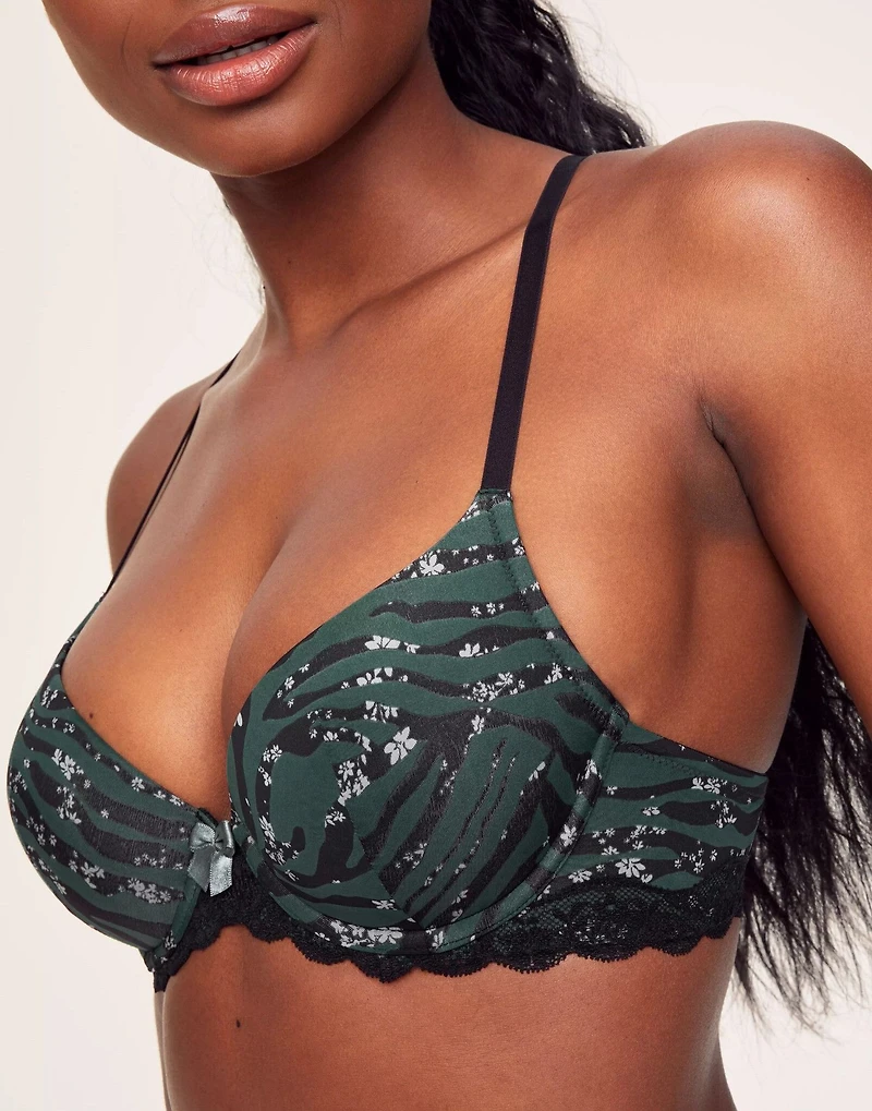 The Kati bra and panties set features a black and green animal print design that is perfect for everyday wear. With a contour demi bra and a matching thong or hipster panty, this set is sure to become a new favorite in your lingerie drawer. (Available in sizes 30A-38DD.)