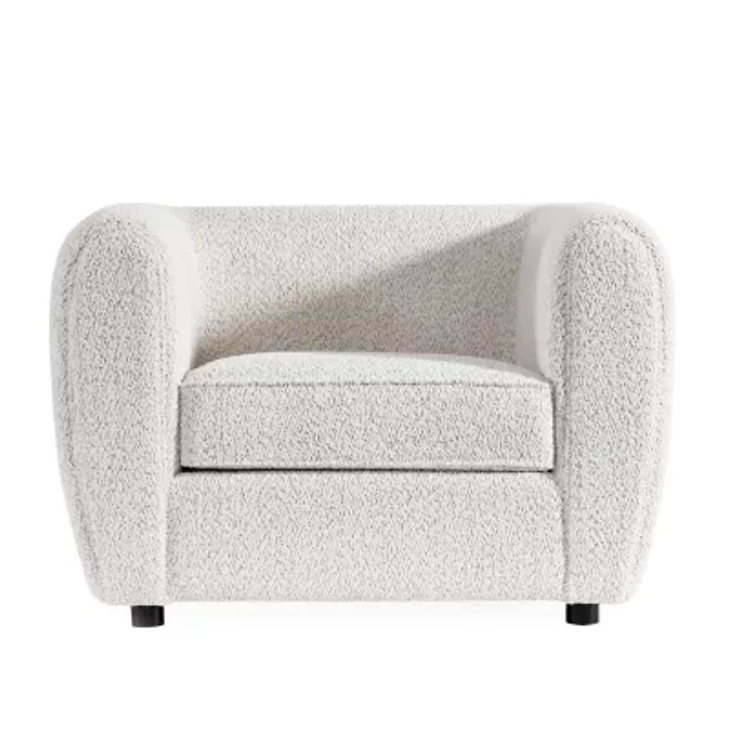 This compact living room ensemble is full of welcomed surprises. The tall arms and low back is an obvious homage to the tuxedo style, but the bulbous shape and smoother lines is a unique twist taking inspiration from the modern era. Underneath the seat cushions are high density foam, making firmer seats than one would expect for the shape that it is in. Finally, soft boucle fabric wraps around the whole piece highlighting a certain air of elegance and quiet class.