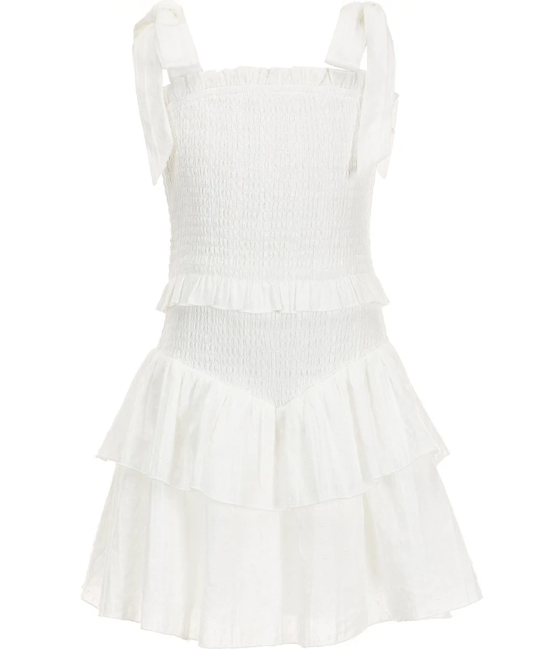 From KatieJNYC, this dress features: Square neckline Sleeveless with tie shoulders Smocked bodice Tie detailing Tiered full skirt 100% viscose Dry clean Imported.