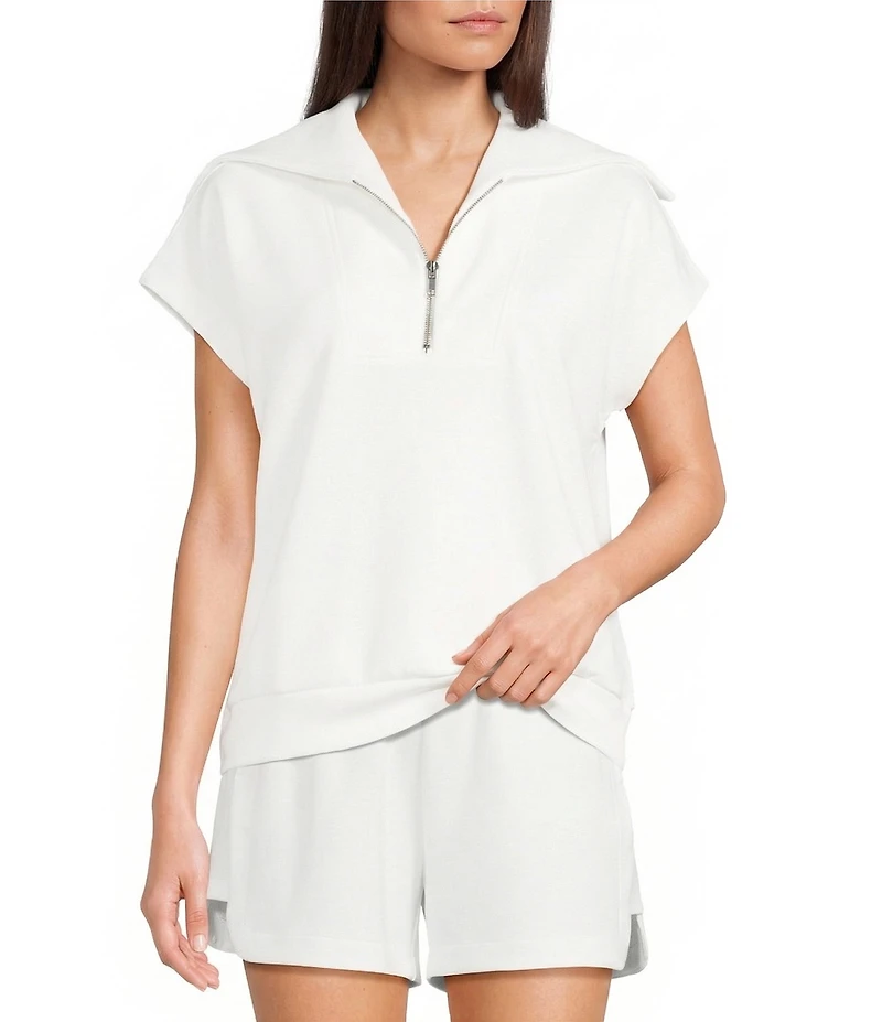 From Katydid, this top features: Half zip Back overlay Short sleeves Relaxed fit Soft buttery fabric Rayon/polyester/spandex Machine wash; hand dry Imported.
