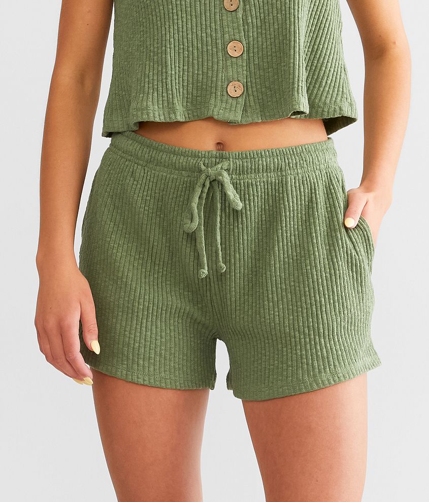 Ribbed 2 1/2" shortie short Rise measures 10" Elasticized cinch tie waistband Side seam pockets